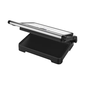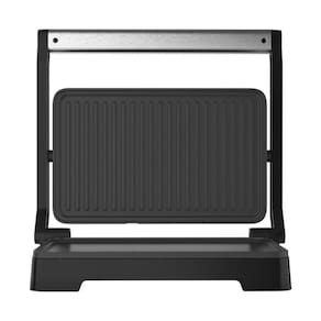 Grill Elétrico com 1200W de potência, chapas antiaderentes lisa e ondulada, estrutura em aço inoxidável, pés antiderrapantes e botão liga/desliga.Termostato regulável