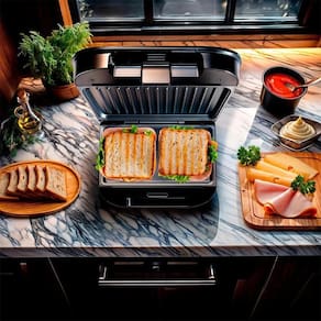 Grill e sanduicheira 2 em 1 Britânia com 750W de potência, revestimento antiaderente, luzes indicadoras de funcionamento e aquecimento, trava de fechamento e base antiderrapante. Permite armazenamento vertical.Funciona como grill