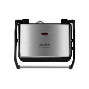 Grill e Sanduicheira Britânia BGR27I Press 2 em 1 com chapa antiaderente, potência de 850W, alça com toque frio e base antiderrapante. Ideal para sanduíches, omeletes e ovos.Funciona como grill