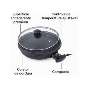 Design moderno e compacto, formato redondo, superfície antiaderente, bandeja coletora de gordura, termostato com controle de temperatura ajustável.Termostato regulável
