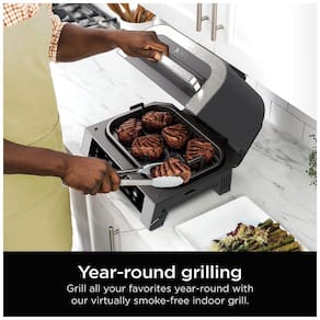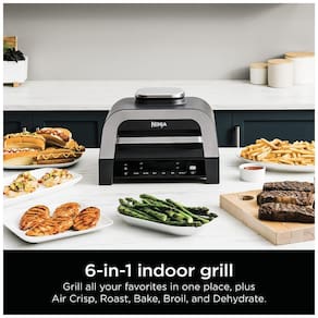 Conheça o Ninja Foodi Smart XL Grill: Atualizado, com design elegante e as mesmas funções e benefícios. Grill de bancada indoor e Fritadeira a Ar com o Sistema de Cozimento Inteligente e Termômetro.