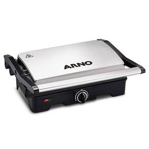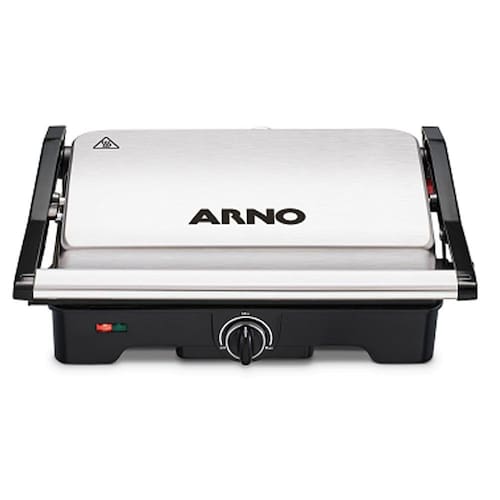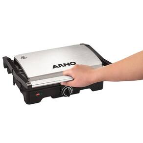 Com abertura de até 180º, as duas placas, inferior e superior, são aquecidas, permitindo que ele seja usado tanto aberto quanto fechado, sendo que a placa superior se ajusta a altura do alimento, para um melhor resultado do seu grelhado. Moderno, na cor inox, tem capacidade para fazer até 4 hambúrgueres e você controla a temperatura através do termostato, para o grelhado chegar no ponto ideal que você tanto gosta. O Grill Arno Dual Gnox possui luz piloto que indica o funcionamento do produto, além disso, vem com alça fria e trava lateral, que garantem maior segurança no manuseio durante o preparo de seus grelhados. Escolha seus ingredientes favoritos e tenha refeições mais saudáveis. Garanta já o seu!