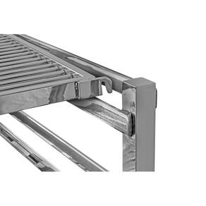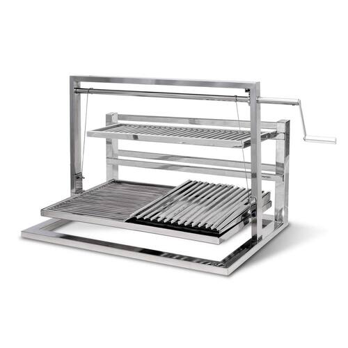 De fácil instalação (encaixe e use), conta com grelhas com manípulos removíveis, e seu sistema de elevação manual permite ajustar a altura do alimento em relação ao fogo.