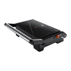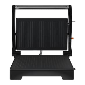 Grill multiuso com duas chapas antiaderentes, potência de 1000W, abertura de até 180°, sistema de aquecimento duplo e termostato regulável.Termostato regulável