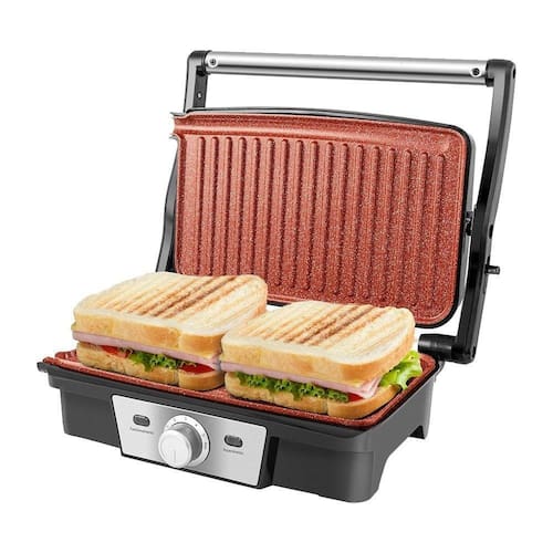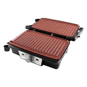 Características Adicionais: Chapas com Revestimento Antiaderente Cerâmico ¿Redstone¿ Chapa Tipo Grill Seletor de Temperatura Tamanho da Chapa: 25 x 17cm Luz Indicadora de Funcionamento - Vermelha Luz Indicadora de Aquecimento – Verde Chapa Superior se Ajusta Conforme Espessura do Alimento Acompanha Dois Coletores de Gordura Abertura 180° Alça de Inox com Toque Frio Acabamento em Aço Inox Pés Antiderrapantes