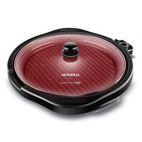 Grill redondo com 40cm de diâmetro, potência de 1270W, grelha antiaderente, controle de temperatura e tampa de vidro temperado com válvula de vapor. Possui coletor de gordura removível e pode ser usado para preparar diversos tipos de receitas.Termostato regulável