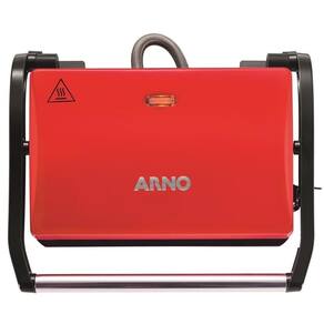 Grill e sanduicheira Arno Luxx Red com placas antiaderentes, 760W de potência, luz piloto, alça fria e trava lateral.Funciona como grill