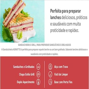 ----------------------------------------------- mobilar eletro ------------------------------------------------ Há 25 anos no mercado de eletrodomésticos, vendendo produtos que te auxiliam nas atividades do dia a dia, trazendo sofisticação e conforto para a sua casa, e qualidade de vida para você e sua família Sanduicheir agratto antiaderente grill com trava e luz funcionamento O jeito mais fácil e rápido de preparar o lanche para sua família. Conheça grill sanduicheira agratto sid inox750w com ela você vai preparar deliciosos sanduiches sem sujeira Peso0.95 kgembalagem23.4 9.3 22.5 cmproduto montado Comprimento: 21.5 cmLargura: 21.5 cmAltura: 8.0 cm Marca: agrattoVoltagem 110v Condição do item: novoLinha: premiumModelo: sid inoxPotência: 750 wTipo de alimentação: elétricaTipos de placas: antiaderenteCom superfície antiaderente: sim