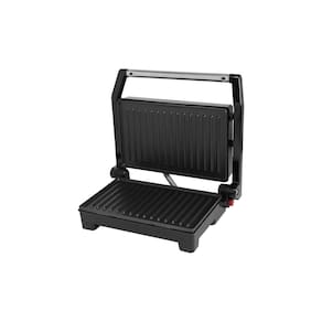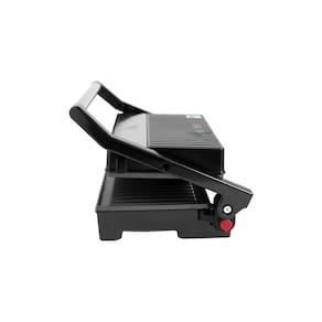 Grill torradeira elétrica com chapas onduladas antiaderentes, alça isotérmica em inox, trava de segurança e pés antiaderentes.Termostato regulável