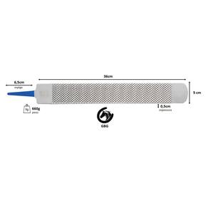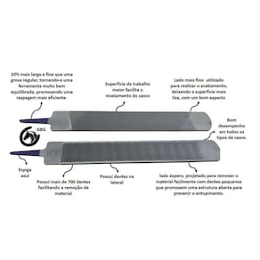 Grosa para casqueamento. Produto , Mustad. A Grosa para casquear cavalo Heller Excel da Mustad é fabricada em aço laminado, tratado termicamente para oferecer uma longa durabilidade e um fio consistente. Possui um lado mais grosso com dentes pequenos e afiados que removem o material com muita efeiciência e um lado mais fino que é utilizado para realizar o acabamento, deixando a superficie fina e com um bom aspecto. Desenvolvida para todos os tipos de cascos, apresenta excelente resultado. Face da Grosa: Um lado áspero que é projetado para remover o material facilmente com dentes de tamanho pequeno, que promovem uma estrutura aberta para prevenir o entupimento. Seu design particular torna esta grosa versátil para uma variedade de climas e qualidade de cascos. 10% mais larga e fina que uma grosa regular, tornando-a uma ferramenta muito bem equilibrada, promovendo uma raspagem mais eficiente. As superfícies de trabalho maiores tornam mais fácil o nivelamento do casco. A face de grosa possui um padrão concentrado com mais de 700 dentes que são menores em tamanho porém possui mais facilidade na remoção de material Face da Lima: Face da lima com corte Heller, mais larga torna mais fácil o nivelamento e nivelamento do casco, deixando um acabamento mais liso. Mais larga, propiciando uma maior área de superfície Permite mínimo esforço e máxima eficiência Resultados positivos em várias condições Durante o grosamento da parede do casco, você pode precisar manter um ângulo maior do que quando utiliza-se uma grosa regular A grosa Heller é muito versátil, permitindo a remoção eficiente de material com pouco esforço, produto , diferenciado com excelente durabilidade. DIMENSÕES: Cumprimento: 36 cm Largura: 5 cm Espessura: 0,5 cm Tamanho da Espiga: 6,5 cm Peso: 660g NÂO ACOMPANHA CABO Marca: Não Informado