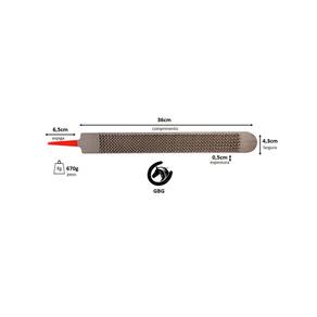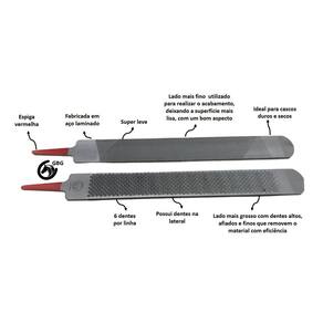 DIMENSÕES: Cumprimento: 36 cm Largura: 4,3 cm Espessura: 0,5 cm Tamanho da Espiga: 6,5 cm Dentes por linha: 6 Peso: 670g