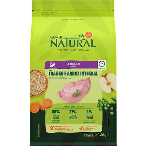 Racao Guabi Natural Gatos Adultos Frango e Arroz . 1,5kg. Condicao corporal equilibrada, com elevada quantidade de carnes e proteinas exclusivamente animais que proporcionam os nutrientes essenciais para a adequada condicao corporal de cada fase de vida;. Funcao intestinal regular, com ingredientes naturais, fibras e pre.bioticos, que favorecem o bom transito intestinal e adequada formacao das fezes;. Protecao para o organismo e longevidade, rico em ingredientes e antioxidantes naturais que proporcionam uma vida mais longa e saudavel;. Saude urinaria, formulado com quantidades equilibradas de minerais e com controle de pH para auxiliar na saude do trato urinario.