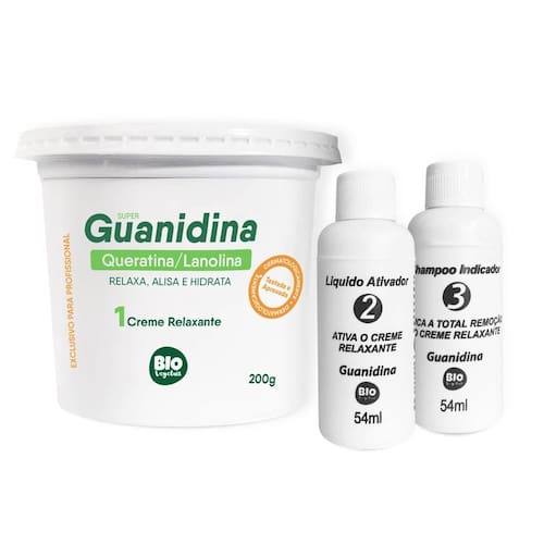 Guanidina biovegetais trihair queratina lanolina alisa 308ml Descrição do produto Cuidados e recomendações antes da aplicação - sempre que utilizar este produto faça o teste de mecha e de toque, pois o processo de fabricação difere das demais marcas existentes. 01 - contém álcali. 02 - cabelos com excesso de brancos podem sofrer alterações de cor. Neste caso é prejudicado o uso de um totalizante que não necessita de oxidantes ou aguardar o prazo necessário para coloração. 03 - utilize apenas cabelos com henê, henna, pastas ou outros alisantes, tinturas progressivas à base sais metálicas , cabelos descoloridos, com reflexo, ou processados por métodos físicos, após 6 meses e com a remoção completa do produto antigo. 04 - após aplicação aguarde 15 dias para fazer uma coloração. 05 - evite tons a partir do louro escuro e ou que utilizem oxidantes de 30 vol ou 40 vol. 06 - não é recomendado o seu uso em gestantes, pois contém substâncias ativas. 07 - não use em crianças. 08 - em caso de contato com os olhos lave-os imediatamente com bastante água. Tendo solicitado suspender o uso e procurar um médico. 09 - não utilizar sob áreas mucosas, pele inflamada ou se a couro cabeludo apresentar lesões ou irritações. 10 - não lave os cabelos ou a fachada massageando por dois dias antes da aplicação do produto. 11 - não utilize escovas ou outros implementos quentes antes, durante ou depois da aplicação do creme relaxante. 12 - proteja o couro cabeludo com o protetor capilar ou vaselina. 13 - este preparado deve ser somente para o fim a que se destina, sendo perigoso para qualquer outro uso art.109 - decreto 79.094/77 . Este produto deverá ser aplicado exclusivamente por profissionais. Material necessário para aplicação: Toalha, pincel, pente plástico de dentes finos/largos, prendedores plásticos, vasilha não metálica e relógio. Marca: Não Informado