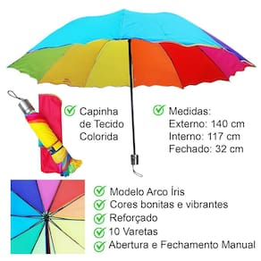 Reforçado, com 10 varetas, varão de ferro, abertura e fechamento manual. Tecido Pongee Multicolorido impermeável de secagem mais rápida que os convencionais.