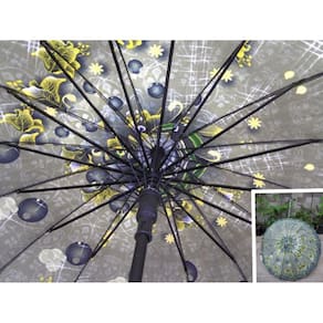 Sombrinha longa com cabo curvo prata com detalhes na lateral permitindo maior firmeza. Vara e ponteira de metal, 16 varetas e haste preta. Tecido de cetim, estrutura reforçada contra vento, abertura automática e fechamento manual.