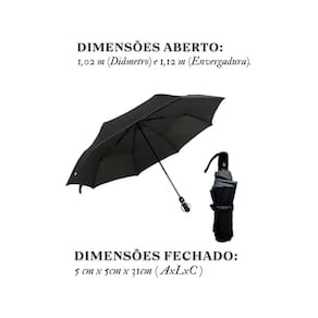 Guarda-chuva de alta resistência e qualidade, sendo um modelo de guarda chuva abre e fecha. O guarda-chuva é dobrável e também um guarda-chuva automático o sistema de acionamento duplo automático, com um clique no botão ele abre e com outro clique no botão ele fecha, para assim evitar o trabalho de abrir e fechar guarda chuva em locais de rápida ação,e também não se molhar todo. O tecido do guarda chuva é de alta qualidade sendo o pongee, ele seca rápido e não encharca. Modelo do guarda chuva portaria voyagem sendo grande na sua abertura e pequeno para guardar. Dimensão fechado: 5 cm x 5 cm x 31cm axlxc aberto: 1,02m diâmetro e 1,12 m envergadura . Descrição: armação e varetas de ferro galvanizado, 08 varetas, varão sextavado galvanizado e cabo curvo com acionador automática, tecido pongee, ideal para bolsas, mochila em cores lisas para combinar com seu estilo.