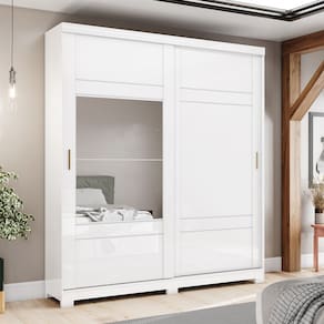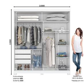 FICHA TÉCNICA: Cor Interna: Pintura UV Texturizada Acabamento: Pintura UV Escala de Brilho: Brilhante Material Principal: MDP Qtd. Gavetas: 3 Peso Máximo por Gaveta: 3 Material do Puxador Gaveta: Alumínio Material da Corrediça: Metálica Simples Material da Gaveta: MDP Qtd. Portas: 2 Material da Dobradiça: Metálica Material do Puxador Porta: Alumínio Tipo Porta: Correr Qtd. Prateleiras: 5 Peso Máximo por Prateleira: 8 Material da Prateleira: MDP Qtd. Pés: 6 Pés Reguláveis: Não Material Pés: ABS Altura Pés/Rodapés: 50mm Possui Rodízios: Não Produto Suporte até -Kg-: 49 Possui Vidro: Não Possui Espelho: 2 Medida do Espelho: 2092x345x15 Possui Espaço para Vestidos Longos: 1 Possui Iluminação: Não Possui Ganchos: Não Medidas Montado: 230 x 200 x 50 Cm Peso Montado: 125 Kg Ean: 7890022134196