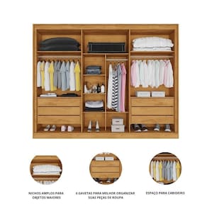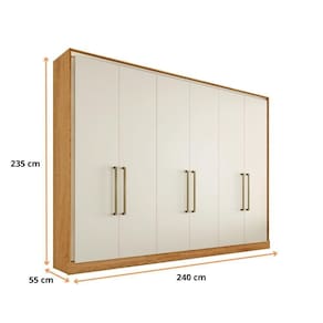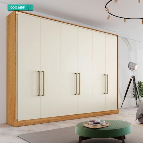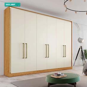 Guarda Roupa 100% mdf 6 Portas Argos Made Marcs Peroba/Off White Guarda roupa casal com 6 portas da bater 100% mdf,06 gavetas com corrediças telescópicas, cabideiros em aluminio, interno ele e ela, puxadores aluminio na cor Bronze. Um modelo funcional feito para deixar seu ambiente completo. Espaço para roupas longas e prateleiras funcionais e maleiro. Uma moldura interna reversivel com sistema flex collor, um lado na co peroba e outro na cor off white.DIMENSÕES Altura:235 cm Largura:240 cm Profundidade:55 cmCARACTERÍSTICAS Acabamento:Acabamento Em Verniz uv Ambiente Principal:Quarto Cor:Peroba Off White EAN:7908241610862 Escala De Brilho:Semi-Brilho Material da corrediça:Telescópicas Material Da Estrutura:MDF Material Principal:MDF Modelo:Argos Número De Prateleiras:7 Peso:209 Kg Quantidade de Gavetas:7 Quantidade de portas:6 Volumes:6informações importantes Acompanha Manual de Instalação:Sim, manual acompanha o produto. Complexidade Da Montagem:Alta; deverá ser montada por um especialista em montagem Garantia:90 dias após a entrega do produto. Informações Complementares:Os objetos que ambientam as fotos não acompanham o produto. Necessita Montagem:Sim, o produto irá desmontado. Recomendações De Uso:Para limpeza utilize somente pano limpo e macio, ligeiramente umidecido em água (apenas o bastante para remover a poeira), seguido de um pano seco. Sistema De Montagem:Parafuso, Minifix E Cavilha Sobre A Montagem:A loja não oferece serviço de montagem dos produtos.