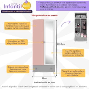 Conforto e organização: Produzido 100% em MDF com acabamento acetinado (cerca de 20% de brilho), o guarda-roupa oferece durabilidade e um visual sofisticado para o seu ambiente. Ele possui 2 portas, sendo uma delas com espelho de vidro lapidado, que além de funcional, garante imagens sem distorção e segurança nas bordas. A gaveta com corrediças telescópicas e trava de segurança proporciona praticidade e segurança no armazenamento de seus itens pessoais. O cabideiro PVC acompanha o móvel, deixando suas roupas longas e curtas sempre organizadas e sem amassar.