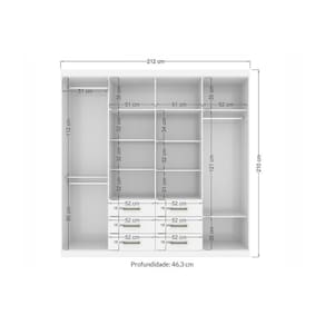 Dimensões(Cm): Comprimento(Profundidade): 46,3cm x Largura: 212cm x Altura: 210cm Material de Estrutura - MDF/MDP Tipo de Pintura - Ultravioleta Tipo de Acabamento da Pintura - Pintura Fosca - Alto Brilho Diferenciais Guarda Roupas - Maleiro Material dos Cabideiros - Cabideira Metálico Quantidade de Portas - 8 Portas de Abrir Tipo de Corrediça - c/ Corrediças Metálicas Quantidade de Gavetas - 6 Gavetas Quantidade de Prateleiras - 9 Montagem do Produto - Desmontável Certificação de Qualidade - Qualidade Aprovada Garantia - 3 meses
