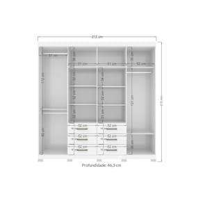 Dimensões(Cm): Comprimento(Profundidade): 46,3cm x Largura: 212cm x Altura: 215cm Material de Estrutura - MDF/MDP Tipo de Pintura - Ultravioleta Tipo de Acabamento da Pintura - Pintura Fosca - Alto Brilho Diferenciais Guarda Roupas - Maleiro Material dos Cabideiros - Cabideira Metálico Quantidade de Portas - 9 Portas de Abrir Tipo de Corrediça - c/ Corrediças Metálicas Quantidade de Gavetas - 6 Gavetas Quantidade de Prateleiras - 9 Montagem do Produto - Desmontável Certificação de Qualidade - Qualidade Aprovada Garantia - 3 meses