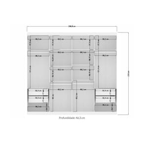 Dimensões(Cm): Comprimento(Profundidade): 46,3cm x Largura: 238,8cm x Altura: 219cm Tamanho dos Acessórios - Casal Material de Estrutura - Estrutura 100% MDP Espessura Material da Estrutura (mm) - Espessura 12mm Tipo de Pintura - Ultravioleta Tipo de Acabamento da Pintura - Semi Brilho Tipo de Acabamento - Acabamento Baixo Relevo Tipo de Moldura do Guarda Roupa - Moldura Robusta com Encabeçamento no Topo Tipo de Rodapé - Possui Rodapé Diferenciais Guarda Roupas - Calceiro - Sapateira - Maleiro - Divisão Ele/Ela Material do Calceiro - Calceiro Metálico Tipo de Cabideiro - Aéreo Material dos Cabideiros - Cabideira Metálico Tipo de Porta do Guarda-Roupa - Portas de Bater Material das Portas - Portas em MDP Tipo de Dobradiças - Dobradiças Metálicas Quantidade de Portas - 8 Portas de Abrir Material das Gavetas - Gavetas em MDP Tipo de Corrediça - c/ Corrediças Telescópicas Quantidade de Gavetas - 4 Gavetas Material das Prateleiras - Prateleiras em MDP Quantidade de Prateleiras - 10 Quantidade de Nichos - 2 Nichos Recomendações de Uso - Recomendações de Uso Montagem do Produto - Desmontável - Necessita de montagem - c/ Opções de Montagem - Acompanha Manual de Instalação e Montagem - Complexidade da Montagem Média - Necessita de Ferramentas para Realizar a Montagem Sistema de Montagem - Inclui kit de instalação Nossa Avaliação - Classificação de Qualidade Excelente Certificação de Qualidade - Qualidade Aprovada Garantia - 3 meses Tipo de Puxador - MDF