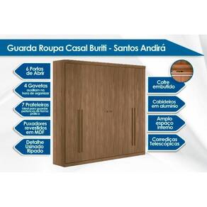 Dimensões(Cm): Guarda Roupa Casal 6 Portas (2 Ripadas) e 4 Gavetas Buriti Comprimento(Profundidade): 46,3 cm Largura: 231,6 cm Altura: 219 cm