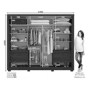 Dimensões(Cm): Comprimento(Profundidade): 54cm x Largura: 230cm x Altura: 52cm Material de Estrutura - MDF/MDP Tipo de Pintura - Ultravioleta Tipo de Acabamento da Pintura - Semi Brilho Tipo de Acabamento - Acabamento Interno Branco Diferenciais Guarda Roupas - Calceiro - Sapateira - Divisão Ele/Ela Material dos Cabideiros - Cabideira Metálico Diferenciais das Portas - Fechamento c/ Freio Anti-Impacto Quantidade de Portas - 2 Portas de Correr Tipo de Corrediça - c/ Corrediças Telescópicas Quantidade de Gavetas - 4 Gavetas Quantidade de Prateleiras - 7 Montagem do Produto - Desmontável Certificação de Qualidade - Qualidade Aprovada Garantia - Garantia de 90 Dias