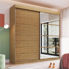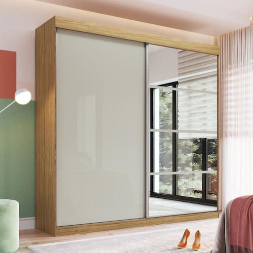 MDP 15mmUm Guarda-roupa para transformar o seu ambiente. Com 2,40m de largura e 2,34m de altura tem muito espaço de organização. Suas portas de correr garantem aproveitamento do espaço do seu quarto, e a montagem flex das portas permite que você escolha a melhor composição entre as cores naturalle e cristalo. Acompanha ainda espelhos para otimizar ainda mais o espaço. Com 4 gavetas internas, com corrediças telescópicas, cabideiros e puxadores em alumínio, a qualidade do seu produto é garantida. São três maleiros, dois cabideiros e um total de quinze nichos para deixar tudo organizado. Um roupeiros lindo e funcional.