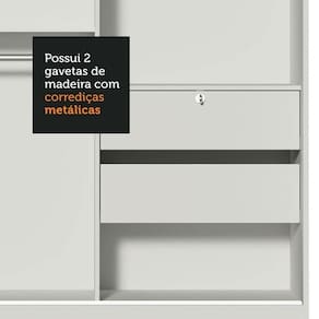 Internamente o espaço é ótimo: são duas gavetas com corrediças metálicas, sendo que uma delas possui fechadura, para uma maior segurança. Além disso, são cinco nichos e dois cabideiros de metal, com espaço para roupas curtas e longas.