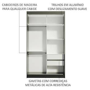 Internamente, contempla duas gavetas com corrediças metálicas, diversas prateleiras e nichos, além de dois cabideiros de madeira com espaço para roupas longas e curtas. A profundidade maior é um grande diferencial.