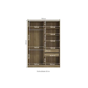 Acabamento: Pintura Brilho / Pintura Touch | Acabamento da Fita Borda: Papel | Cor: Nogueira/Branco | Corrediças: Telescópicas | Garantia: 3 meses para defeito de fabricação | Gavetas: Internas | Matéria-prima: MDP | Peso suportado por cabideiro: 10 | Peso suportado por cada prateleira: 7 kg | Puxadores: Alumínio | Quantidade de calceiros: 2 | Quantidade de gavetas: 2 | Quantidade de portas: 2 | Quantidade de prateleiras: 6 | Sistema de montagem: Parafuso Philips / Parafuso Philips e Minifix | Tipo de porta: Correr