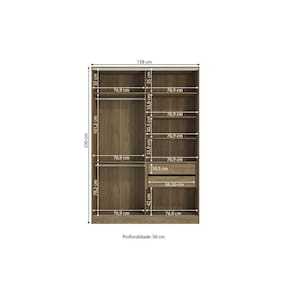 Acabamento: Pintura Touch | Acabamento da Fita Borda: Papel | Cor: Nogueira | Corrediças: Telescópicas | Garantia: 3 meses para defeito de fabricação | Gavetas: Internas | Matéria-prima: MDP | Peso suportado por cabideiro: 10 | Peso suportado por cada prateleira: 7 kg | Puxadores: Alumínio | Quantidade de calceiros: 2 | Quantidade de gavetas: 2 | Quantidade de portas: 2 | Quantidade de prateleiras: 6 | Sistema de montagem: Parafuso Philips / Parafuso Philips e Minifix | Tipo de porta: Correr