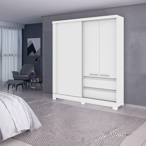 Roupeiro Condor, em madeira de mdp, com 03 portas (01 porta de correr e 02 portas batentes ), 02 gavetas externas, 03 prateleiras, 01 cabideiro, corrediças metálicas, amplo espaço interno, acabamento em pintura UV. Acabamento da Prateleira: Pintura UV Escala de Brilho da Prateleira: Fosco Possui Cabideiros: 01 Acabamento da Gaveta: Pintura UV Possui Organizador de Gaveta: Não Acabamento da Porta: Pintura UV Escala de Brilho da Porta: Fosco Acabamento dos Pés: Pintura Altura dos Pés: 7 Ambiente Principal: Quarto Complexidade da Montagem: Média: pode ser montado por mais de uma pessoa e/ou necessite de maior conhecimento para montagem Cor: Branco Cor do Produto: Branco Cor Interna: Branco Escala de Brilho: Brilhante Gaveta com Chave: Não Itens Inclusos: 1 Guarda Roupa, Kit Ferragens e Manual de Montagem Linha ou Coleção: Classic Manual de Montagem e Instalação: https://cdn2.madeiramadeira.com.br/atributo/atualle-moveis/1206538-manual-de-montagem-roupeiro-condor-3-portas-bc-3115.pdf Material da Gaveta: MDP Material da Porta: MDP Material da Prateleira: MDP Material dos Pés: PVC Material Principal: MDP Necessita Montagem: Sim Origem do Produto: Nacional Peso: 92.67 Peso Máximo por Gaveta: 6 Peso Máximo por Prateleira: 12 Possui Calceiros: Não Possui Espelho: Não Possui Pés: 06 Possui Portas: 03 Possui Prateleiras: 03 Recomendações de Uso, Manutenção e Limpeza: Para limpar, utilizar somente um pano úmido Sapatas Niveladoras: Não Sistema de Montagem: Parafusos, pregos, cavilhas, pinos. Tipo de Corrediça da Gaveta: Metálica Simples Tipo de Dobradiça/Corrediça da Porta: Metálica Tipo de Gaveta: Externa Tipo de Guarda-Roupa: Casal Tipo de Puxador da Gaveta: Não Possui Tipo de Puxador da Porta: Externo