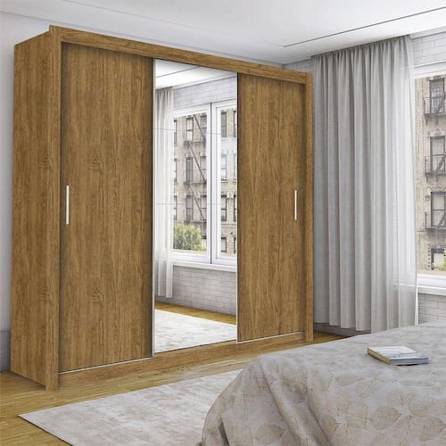 Guarda Roupa 3 portas de correr com Espelho Isabela Luxo Freijo com 1,85 de largura 2,08 de altura e 0,46 de profundidade. Acompanha 4 espelhos na porta do meio, que alem de serem funcionais, trazem a sensacao de amplitude, principalmente em ambientes menores. Sua cor freijo combina facilmente com todos os estilos de decoracoes, alem de deixar o seu quarto com um visual sofisticado. Ideal para cabides de ate 37cm, ele possui em seu interior 4 gavetas e 4 prateleiras para guardar suas roupas de cama, banho e o que mais for preciso, com a elegancia e qualidade.