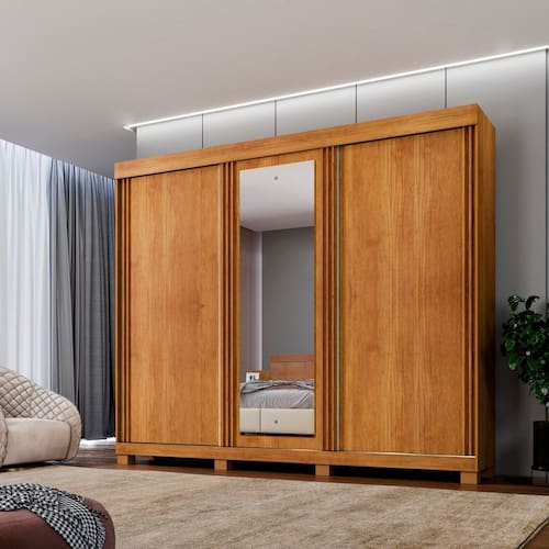 O Roupeiro Siena é um móvel produzido em chapa de 15 mm, garantindo robustez e maior durabilidade. Composto por 3 portas ripadas e uma espelhada, oferece 9 prateleiras e 6 gavetas com corrediças telescópicas, além de um cabideiro em alumínio e acabamento das portas também em alumínio. Seu trilho inferior de alumínio assegura suavidade na abertura das portas, e ainda conta com espaço para roupas longas e pés inclusos. Tudo isso faz do Roupeiro Siena uma opção com ótimo custo-benefício para organizar e valorizar o ambiente. Acabamento da Prateleira: BP Melamínico Escala de Brilho da Prateleira: Fosco Possui Cabideiros: 03 Acabamento da Gaveta: BP Melamínico Escala de Brilho da Gaveta: Fosco Tipo de Corrediça: Metálica Telescópica Possui Organizador de Gaveta: Não Acabamento da Porta: BP Melamínico Escala de Brilho da Porta: Fosco Material do Puxador da Porta: Alumínio Altura do Espelho: 180 cm Altura dos Pés: 10 Altura Máxima dos Pés: 10.0000 Ambiente Principal: Quarto codigo_ean: 7909903487358 Complexidade da Montagem: Alta: deve ser montado por um montador especializado Cor: Cinamomo/Off-White Flex Cor do Produto: Cinamomo/Off-White Flex Escala de Brilho: Fosco Espessura do Espelho: 3 mm Formato do Espelho: Retangular Gaveta com Chave: Não Itens Inclusos: 1 Guarda-Roupa, Kit Ferragens e Manual de Montagem Largura do Espelho: 48 cm Linha ou Coleção: Siena Manual de Montagem e Instalação: https://product-hub-prd.madeiramadeira.com.br/879115/documents/5454d94e-5d1e-48f8-8265-157f9a778c069537benetilferragemtamreal.pdf Material da Gaveta: MDP Material da Porta: MDP Material da Prateleira: MDP Material dos Pés: PVC Material Principal: MDP modular: Não Montagem Flex: Sim, o cliente tem a opção das portas serem flex, de uma lado da cor do predominante do produto e do outro é Off-White. Necessita Montagem: Sim Origem do Produto: Nacional Peso: 216,5 kg Peso Máximo por Gaveta: 3 kg Peso Máximo por Prateleira: 5 kg Possui Calceiros: Não Possui Espelho: Sim Possui Pés: 08 Possui Portas: Sim Possui Prateleiras: Sim Produto Montado: Sim Quantidade de Espelho: 01 Quantidade de Gavetas: 06 Gavetas Quantidade de Prateleiras: 09 Prateleiras Recomendações de Uso, Manutenção e Limpeza: Limpeza com pano macio e levemente umedecido. Não utilizar solventes a base e de inflamáveis. Não utilizar produtos abrasivos. Sistema de Montagem: PARAFUSOS E CAVILHAS Tipo de Corrediça da Gaveta: Metálica Telescópica Tipo de Dobradiça/Corrediça da Porta: Telescópica Tipo de Fixação do Espelho: Molduras Tipo de Gaveta: Interna Tipo de Guarda-Roupa: Casal Tipo de Puxador da Gaveta: Embutido Tipo de Puxador da Porta: Embutido