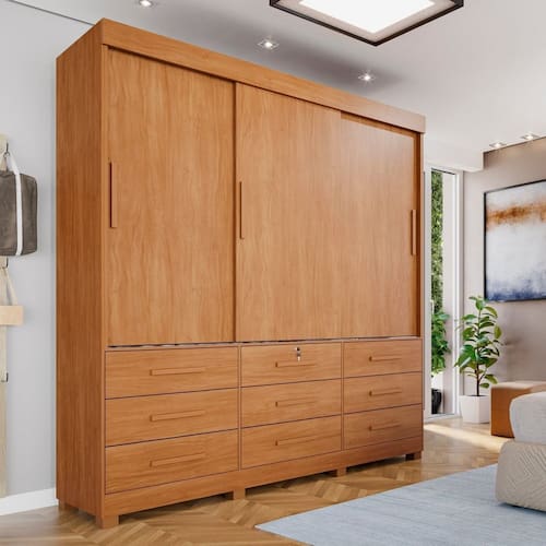O Guarda Roupa Florença é produzido em chapa de 15mm, com 3 portas de correr. Possui trilho de alumínio anti queda que garante durabilidade e modernidade. Contém 4 prateleiras e 9 gavetas com corrediças telescópicas, sendo uma delas com chave, proporcionando suavidade e melhor durabilidade. Além disso, conta com cabideiro e trilho em alumínio. Acabamento da Prateleira: BP Melamínico Escala de Brilho da Prateleira: Fosco Possui Cabideiros: Sim Acabamento da Gaveta: BP Melamínico Possui Organizador de Gaveta: Não Acabamento da Porta: BP Melamínico Escala de Brilho da Porta: Semi-Brilho Material do Puxador da Porta: PVC Altura dos Pés: 7 cm Altura Máxima dos Pés: 7.0000 Ambiente Principal: Quarto codigo_ean: 7909903736418 Complexidade da Montagem: Alta: deve ser montado por um montador especializado Cor: Cinamomo / Off White Cor do Produto: Cinamomo / Off White Cor do Puxador: Marrom Escala de Brilho: Fosco Espessura da Estrutura (mm): 15 mm Espessura das Portas (mm): 15 mm Espessura das Prateleiras (mm): 15 mm Espessura do Fundo (mm): 3 mm Espessura do Fundo das Gavetas (mm): 3 mm Gaveta com Chave: Sim Itens Inclusos: 1 Guarda-Roupa, Kit Ferragens e Manual de Montagem Linha ou Coleção: Florença Manual de Montagem e Instalação: https://product-hub-prd.madeiramadeira.com.br/911784/documents/87191b4c-d023-4cfe-afd3-0359826012c22037929352817180551340396.pdf Marca: Espresso Móveis Material da Gaveta: MDP Material da Porta: MDP Material da Prateleira: MDP Material dos Pés: PVC Material Principal: MDP modular: Não Necessita Montagem: Sim Origem do Produto: Nacional Peso: 135 kg Peso Máximo por Gaveta: 3 kg Peso Máximo por Prateleira: 5 kg Possui Calceiros: Não Possui Espelho: Não Possui Pés: 08 Possui Portas: Sim Possui Prateleiras: Sim Produto Montado: Sim Quantidade de Cabideiros: 02 Cabideiros Quantidade de Gavetas: 09 Gavetas Quantidade de Prateleiras: 04 Prateleiras Recomendações de Uso, Manutenção e Limpeza: Limpeza com pano macio e levemente umedecido. Não utilizar solventes a base e de inflamáveis. Não utilizar produtos abrasivos. Sistema de Montagem: PARAFUSOS E CAVILHAS Tipo de Corrediça da Gaveta: Metálica Telescópica Tipo de Dobradiça/Corrediça da Porta: Telescópica Tipo de Gaveta: Externa Tipo de Guarda-Roupa: Casal Tipo de Puxador da Gaveta: Externo Tipo de Puxador da Porta: Externo