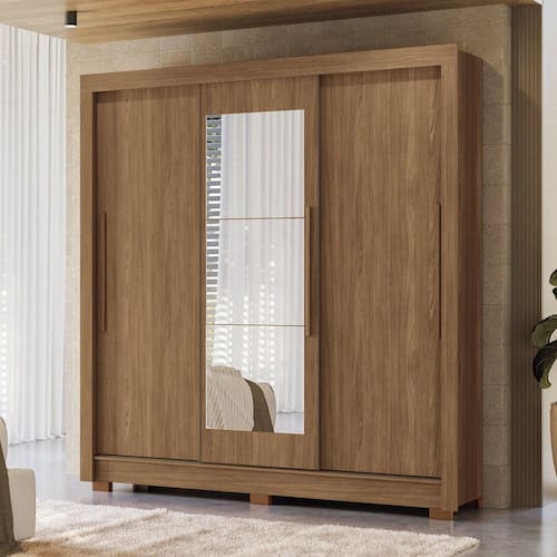 O guarda-roupa 3 portas de correr Maringá da Santos Andirá é um móvel de alta qualidade, beleza e funcionalidade. Seu design de 3 portas de correr é uma ótima opção para espaços mais ajustados, possui 2 amplas gavetas internas com corrediças telescópicas para acomodar todos os pertences da família. As portas deslizam sob trilhos de alumínio e possuem freios, para ajustar onde quer que a porta pare ao abrir, e os puxadores são em MDF revestidos. Este guarda roupa já vem acompanhado pelos pés em PVC, para a maior comodidade na hora da montagem, permitindo assim, a opção do consumidor quando montar. Internamente, este móvel possui várias prateleiras e também cabideiros em alumínio. Produzido dentro das normas de sustentabilidade. Acabamento da Prateleira: Pintura UV Escala de Brilho da Prateleira: Fosco Possui Cabideiros: Sim Acabamento da Gaveta: Verniz Escala de Brilho da Gaveta: Fosco Possui Organizador de Gaveta: Não Acabamento da Porta: Verniz Escala de Brilho da Porta: Fosco Material do Puxador da Porta: MDF Acabamento dos Pés: Poliéster Altura do Espelho: 53 cm Altura dos Pés: 5 cm Altura Máxima dos Pés: 5.0000 Ambiente Principal: Quarto codigo_ean: 7900288113382 Complexidade da Montagem: Média: pode ser montado por mais de uma pessoa e/ou necessite de maior conhecimento para montagem Cor: Jatoba Cor do Produto: Jatoba Cor do Puxador: Marrom Cor Interna: Jatobá Escala de Brilho: Fosco Espessura da Estrutura (mm): 12 mm Espessura das Portas (mm): 12 mm Espessura das Prateleiras (mm): 12 mm Espessura do Espelho: 3 mm Espessura do Fundo (mm): 2,5 mm Espessura do Fundo das Gavetas (mm): 2,5 mm Fita Integrada: Sim Formato do Espelho: Quadrado Gaveta com Chave: Não Guarda-Roupa Suporta Até (kg): 93 kg Itens Inclusos: 1 Guarda-Roupa, Kit de Ferragens e Manual de Montagem Largura do Espelho: 51 cm Linha ou Coleção: Linha Paraná Manual de Montagem e Instalação: https://product-hub-prd.madeiramadeira.com.br/982385/documents/f48a300b-2f0a-45ea-b620-365f20a86b2e87141742587516982385150871.pdf Marca: Santos Andirá Material da Gaveta: MDP Material da Porta: MDP Material da Prateleira: MDP Material dos Pés: PVC Material Principal: MDP modular: Não Necessita Montagem: Sim Nicho com Cabideiro: Não Origem do Produto: Nacional Peso: 117,95 kg Peso Máximo por Gaveta: 3 kg Peso Máximo por Prateleira: 8 kg Porta Janelada: Não Possui Espelho: Sim Possui Pés: 06 Possui Portas: Sim Possui Prateleiras: Sim Produto Montado: Sim Quantidade de Cabideiros: 03 Cabideiros Quantidade de Espelho: 03 Espelhos com Tamanhos Iguais Quantidade de Gavetas: 02 Gavetas Quantidade de Portas com Espelhos: 1 Porta com Espelho Quantidade de Prateleiras: 05 Prateleiras Recomendações de Uso, Manutenção e Limpeza: Durabilidade: Permite ser desmontado e montado até cinco vezes. 5 – Manutenção: Não limpar com álcool ou qualquer outro produto químico, utilize somente pano seco ou levemente umedecido. Sapatas Niveladoras: Não Sistema de Montagem: Parafusos, Cavilha, Minifix Tipo de Corrediça da Gaveta: Metálica Telescópica Tipo de Dobradiça/Corrediça da Porta: Alumínio Tipo de Fixação do Espelho: Fita Dupla Face Tipo de Gaveta: Interna Tipo de Guarda-Roupa: Solteiro Tipo de Puxador da Gaveta: Não Possui Tipo de Puxador da Porta: Externo