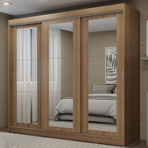 O Guarda-Roupa Kansas da Madesa possui três portas de correr com deslizamento suave, trilhos em alumínio para maior resistência e dois puxadores externos. Além disso, todas as portas possuem espelhos, que deixam o móvel muito mais bonito e ampliam o ambiente.
