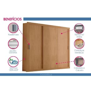 Material dos Cabideiros - Cabideira Metálico Material do trilho da porta de correr - Trilho Metálico Quantidade de Portas - 3 Portas de Correr Tipo de Espelho - Sem Espelho Tipo de Corrediça - c/ Corrediças Metálicas Quantidade de Gavetas - 4 Gavetas Quantidade de Prateleiras - 4