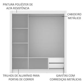 O aproveitamento interno é ideal para um casal. São duas gavetas com corrediça metálica, além de vários nichos que facilitam a organização de roupas, calçados e acessórios. O tubo cabideiro é metálico, muito resistente e possui espaço para roupas longas.