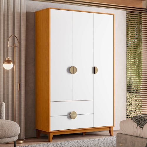 Transforme seu quarto com o Guarda-Roupa Ipê! Com 3 portas e 2 gavetas, oferece espaço amplo e organizado. Os puxadores de ABS metalizado dourado e os apliques remetendo à palha indiana adicionam um toque de estilo único. Suas portas com dobradiças slow motion garantem fechamento suave, enquanto o cabideiro em alumínio e os pés em madeira garantem durabilidade e sofisticação. Renove seu espaço com o Guarda-Roupa Ipê e desfrute de funcionalidade com elegância.