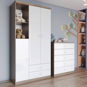 Guarda Roupa e Cômoda Bala de Menta, conjunto pensado para compor um ambiente infantil funcional e acolhedor! Produzidos em MDP e MDF 12/15/25 mm (fundo 3 mm) com pintura UV texturizada. O Guarda Roupa conta com portas com dobradiças metálicas, gavetas com corrediças metálicas para abertura suave e puxadores em ABS. Conta também com prateleira interna, cabideiro em alumínio e prateleiras decorativas laterais. Cômoda conta com gavetas com corrediças metálicas. NÃO ACOMPANHA OBJETOS E DEMAIS DECORAÇÕES. Produto será entregue em 02 volumes.