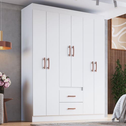 O Guarda Roupa Rivera é perfeito para ser utilizado em um espaço mais compacto, fabricado em MDP , ótimo aproveitamento do espaço interno, 6 portas de bater com puxadores em pvc cor cobre, 2 gavetas com corrediças plásticas, 2 prateleiras, cabideiros na vertical em madeira revestida. Este modelo tem tudo que o seu quarto precisa para ficar muito mais aconchegante! Possui Cabideiros: Sim Acabamento da Gaveta: Pintura UV Escala de Brilho da Gaveta: Fosco Material do Puxador da Gaveta: PVC Possui Organizador de Gaveta: Não Acabamento da Porta: Pintura UV Escala de Brilho da Porta: Brilhante Material do Puxador da Porta: PVC Ambiente Principal: Quarto codigo_ean: 7909903489055 Complexidade da Montagem: Baixa: pode ser montado por uma pessoa sozinha Cor: Branco Cor do Produto: Branco Cor Interna: Maple Escala de Brilho: Brilhante Gaveta com Chave: Não Guarda-Roupa Suporta Até (kg): 40 kg Itens Inclusos: 1 Guarda Roupa, Kit Ferragens e Manual de Montagem Linha ou Coleção: Smart Manual de Especificação Técnica: https://product-hub-prd.madeiramadeira.com.br/873806/documents/8e7ecbfc-e457-4b6e-a00e-386b83ff86b86483e11261486rp10206manual.pdf Manual de Montagem e Instalação: https://product-hub-prd.madeiramadeira.com.br/873806/documents/91503785-7132-4682-9672-16b021e51a6febe3e21261485rp10206manual.pdf Material da Gaveta: MDP Material da Porta: MDP Material Principal: MDP modular: Não Montagem Flex: Não Necessita Montagem: Sim Origem do Produto: Nacional Peso: 57 kg Peso Máximo por Gaveta: 5 kg Possui Calceiros: Não Possui Espaço para Vestidos Longos: Não Possui Espelho: Não Possui Espelho Interno: Não Possui Ganchos: Não Possui iluminação: Não Possui Nichos: Não Possui Painel de TV: Não Possui Pés: Não Possui Portas: Sim Possui Prateleiras: Não Possui Sapateira: Não Produto Montado: Sim Quantidade de Gavetas: 02 Gavetas Recomendações de Uso, Manutenção e Limpeza: Limpar com flanela levemente umedecida Sistema de Montagem: Parafusos Suporta Até (kg): 40 kg Tipo de Corrediça da Gaveta: Plástica Tipo de Dobradiça/Corrediça da Porta: Metálica Tipo de Gaveta: Externa Tipo de Guarda-Roupa: Solteiro Tipo de Puxador da Gaveta: Externo Tipo de Puxador da Porta: Externo
