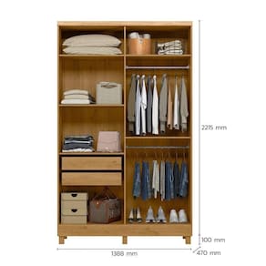 Cabideiros oblongos metálicos e ótima divisão interna para roupas longas;