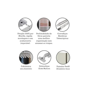 O Guarda Roupa Modulado Prime foi desenvolvido se adequando a vários espaços, de grandes a pequenos. Possui 236 cm de altura oferece divisórias para atender diversas necessidades, profundidade de 56cm possibilitando acomodar roupas sem amassar. Produzido em MDP de 15mm, dobradiças Slowmotin reforçadas em 35mm, corrediças telescópicas, a montagem é inteira por minifix que proporciona um acabamento impecável e fundos embutidos com perfil usinado para melhor acabamento e maior resistência.