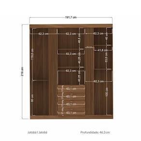 Requer montagem: Sim | Inclui manual de montagem: Sim | Quantidade de caixas de embalagem: 3 | Comprimento: 46,3 | Profundidade: 46,3 | Altura: 219 | Largura: 191,7 | CONTEÚDO DA EMBALAGEM: 1 Guarda Roupa | CORES DO PRODUTO (FILTRO DE CORES): Jatobá | QUANTIDADE DE PORTAS: 4 | MATERIAL PRINCIPAL: MDP | DESCRIÇÃO DO TAMANHO: 219x191,7x46,3 | ALTURA DO PRODUTO (CM): 219 | LARGURA DO PRODUTO (CM): 191,7 | PESO PRODUTO COM EMBALAGEM (KG): 121,25 | ALTURA DO PRODUTO COM EMBALAGEM (CM): 25,1 | COMPRIMENTO PRODUTO COM EMBALAGEM (CM): 224,4 | COMPRIMENTO DO PRODUTO (CM): 46,3 | QUANTIDADE DE GAVETAS: 4 | LARGURA PRODUTO COM EMBALAGEM (CM): 45,7 | PRODUTO PRECISA DE MONTAGEM?: Sim, a montagem é facil mas sugerimos a contratação de um montador para a montagem do produto. Não nos responsabilizamos por danos causados no ato da montagem. | PRODUTO: Guarda Roupa | GARANTIA DO FABRICANTE: 3 | QUANTIDADES DE CAIXAS DE EMBALAGEM: 3 | COR PREDOMINANTE: Jatobá | ESTILO: Clássico | MATERIAL PARA FILTRO: MDP | INSTRUÇÕES/CUIDADOS: Limpar com flanela ou pano macio seco, não utilizar produtos abrasivos, desengordurantes, álcool ou solvente. Não expor o produto diretamente à luz solar e à umidade | ESTADO DE ORIGEM: PR | PESO DO PRODUTO (KG): 117,85 | POSSUI ESPELHOS: Não possui | TIPO DE GUARDA ROUPA: Casal