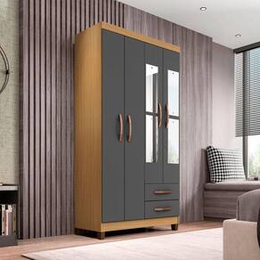 Guarda Roupa 4 Portas e 2 Gavetas Com Espelho Manchester - Carvalho Americano - Grafite - ÉdeCasaMóveis - Cinza
