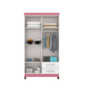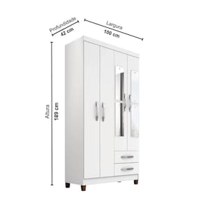 Com 2 gavetas e 4 portas, este guarda-roupas oferece amplo espaço de armazenamento para roupas, acessórios e objetos pessoais. As prateleiras suportam até 5 kg, enquanto as gavetas podem suportar até 3 kg cada. Além disso, ele possui 1 cabideiro em metal e 6 puxadores que complementam seu design moderno.