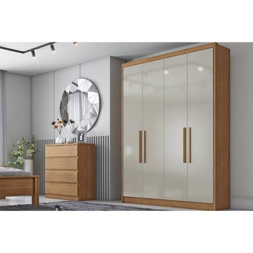 Material do Calceiro - Calceiro Metálico Tipo de Cabideiro - Aéreo Material dos Cabideiros - Cabideira Metálico Tipo de Porta do Guarda-Roupa - Portas de Bater Material das Portas - Portas em MDF Tipo de Dobradiças - Dobradiças de 35mm com Amortecimento - Dobradiça de Pressão Diferenciais das Portas - Porta c/ Espelho Quantidade de Portas - 4 Portas de Abrir Quantidade de Portas com Espelho - 2 Portas com Espelho Tipo de Espelho - Espelho Externo Quantidade de Espelhos - 2 Espelhos Material das Gavetas - Gavetas em MDF Tipo de Corrediça - c/ Corrediças Telescópicas Quantidade de Gavetas - 3 Material das Prateleiras - Prateleiras em MDF Quantidade de Prateleiras - 4